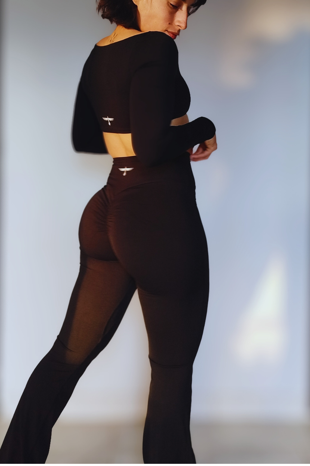 La calza flare de tiro alto con frunce trasero, te da libertad de movimiento sin resignar estilo.