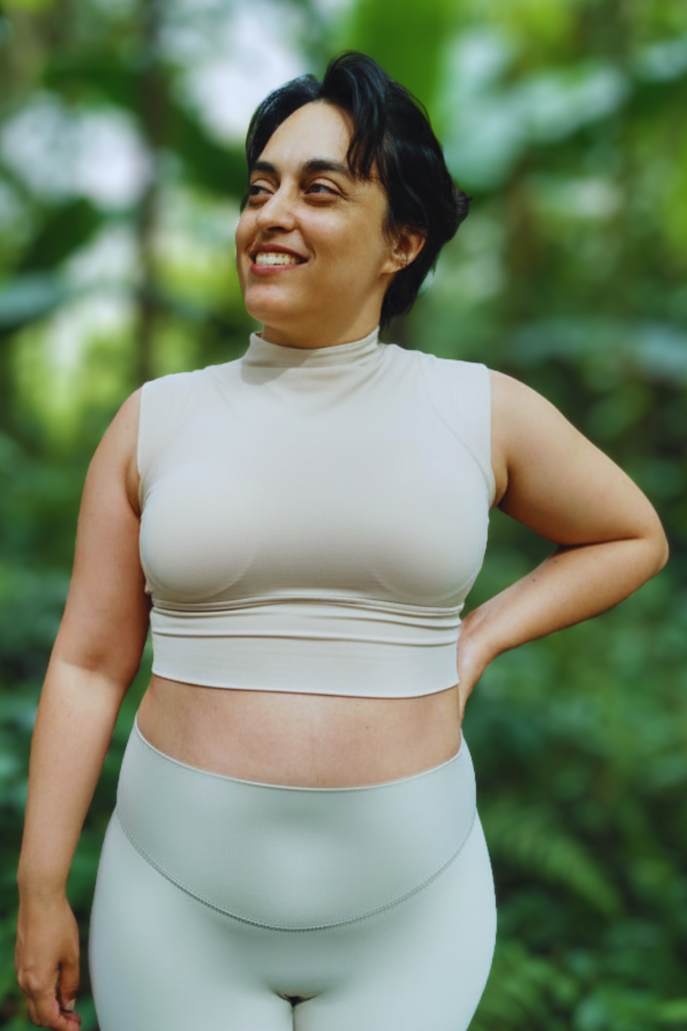Tiene un largo de apoximadamente medio torso, incluye relleno no removible. Está confeccionado en una mezcla de lycra y nylon, con un tejido ligero, de secado rápido, transpirable y que elimina el sudor, ideal para moverte sin restricciones.